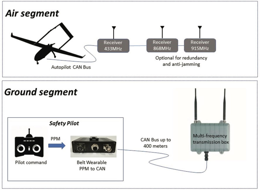 The MFTB transmits RC Command signals to UAV autopilot in one or multiple frequencies.